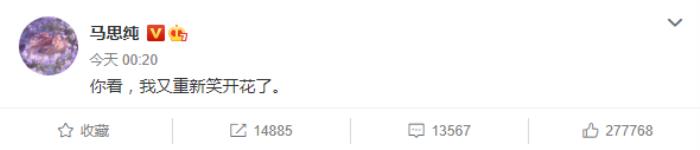 她本人更是在微博发文表示:“你看,我又重新笑开花了。” 一直有良好合作关系的饶雪漫也留言道:“既然花都开好了,就去恋爱吧!”