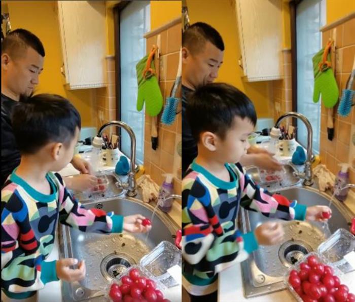 虽然照片里榕榕的儿子没有露面但是她在几个小时之前就发视频预告了丈夫和儿子在厨房准备食材的画面,父子俩齐心协力在厨房清洗小番茄,两个人像流水线工人一样一个洗完递给另一个人再冲洗一遍。