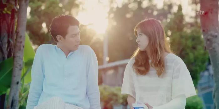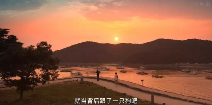 那天夕阳西下,落日很美,两个人就这样在水边走着走着,一前一后的拌嘴,让人看着不自觉露出姨母笑。
