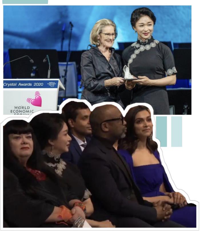 在2020冬季达沃斯论坛上,穿着中式经典复古旗袍亮相会场,深色系旗袍选择显得端庄大气,流露出成熟的魅力