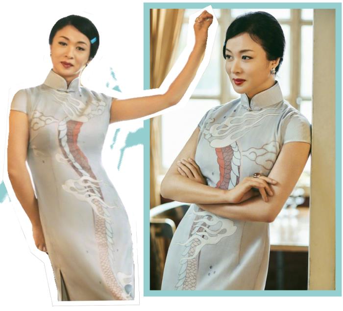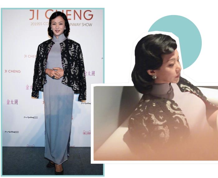 金星选择搭配的这件旗袍整体简约端庄,旗袍用暗灰色作为主体,庄重的同时不显压抑
