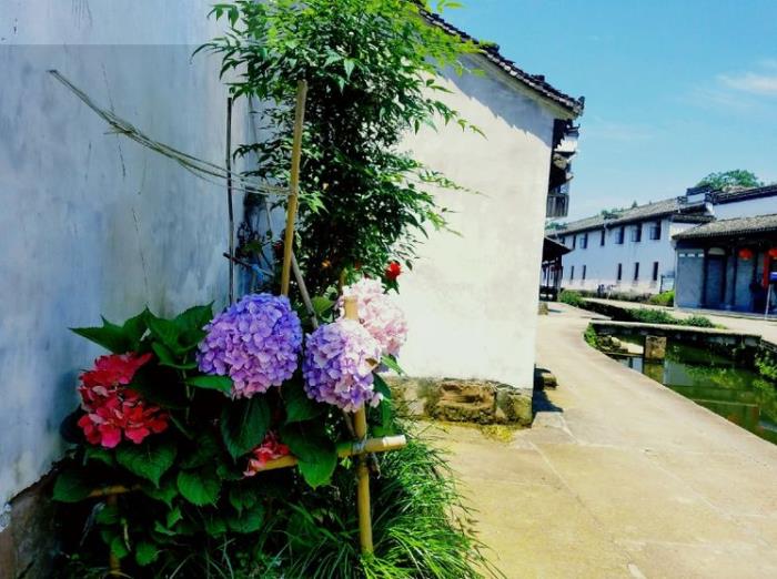 离了廊桥,可以移步水边的“美人靠”,翠绿的河水静静淌着,青墙边开有紫郁湛蓝的无尽夏。