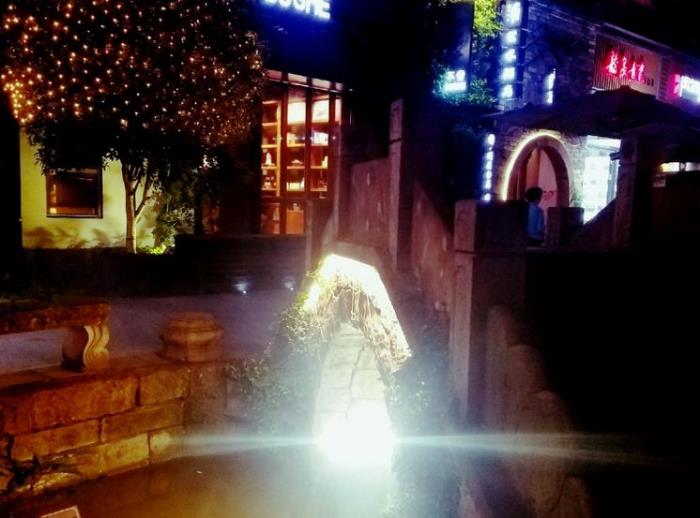 当飘逸的水雾从桥洞溢出,环绕着苇草在灯影下婷婷而立,加上那些不知名的绿植远远近近妆点着朦胧的夜色。