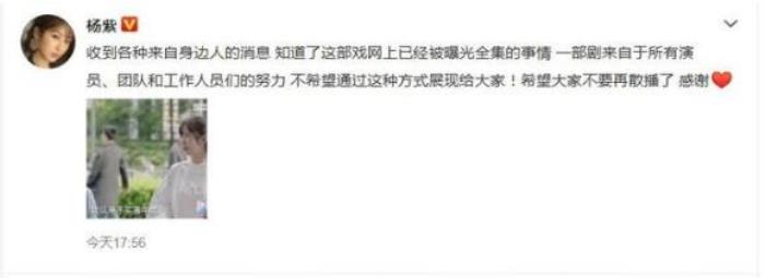 在22日,作为剧中主演的杨紫在微博上主动发文呼吁大家抵制黄牛,对于自己新剧还未正式播出内容就被泄露的情况,杨紫呼吁道:“一部剧来自于所有演员、团队和工作人员们的努力,不希望通过这种方式展现给大家!”