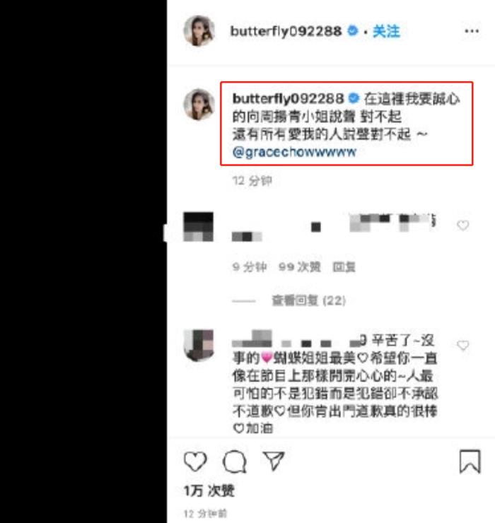 25日,蝴蝶姐姐在社交平台发文,向周扬青认错,这也坐实了她与罗志祥的关系。