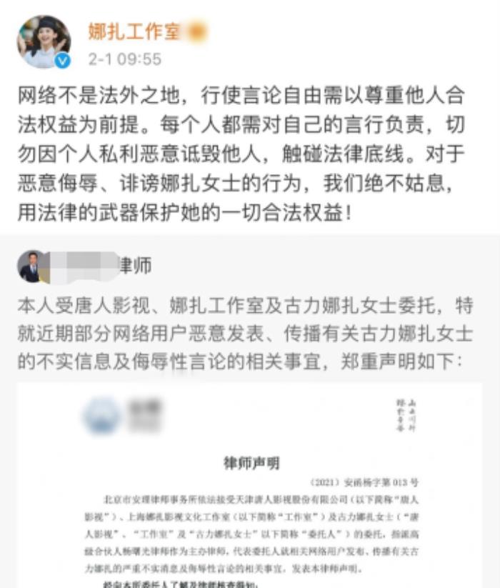 之后古力娜扎的工作室也转发了相关动态,提醒大家尊重别人的合法权益,对自己的言论负责,不要恶意诋毁别人,做出违反法律的事情。
