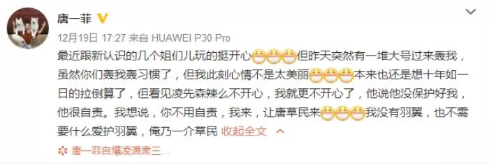 去年《妻子的浪漫旅行》让唐一菲圈了不少粉丝,但在去年12月19日唐一菲开通了微博,并连发六条微博,澄清自己并非第三者并怒怼当年网暴她的网友。