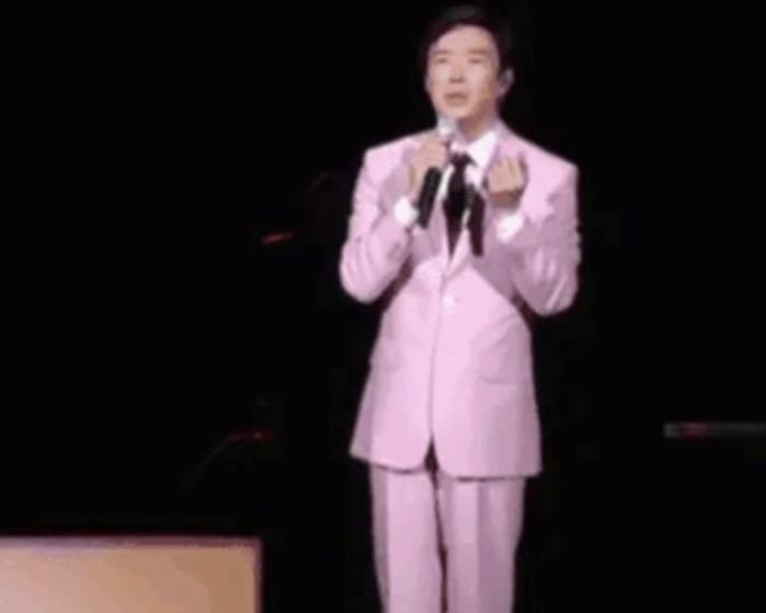 站在台上,身穿整齐的西装,皮鞋擦得锃亮,发量稳定的三七开发型,手拿麦克风,抬头45度仰望远方,唱到动情处,还会做出一些恰到好处的表情配合歌唱,情浓时还会踮起脚尖。