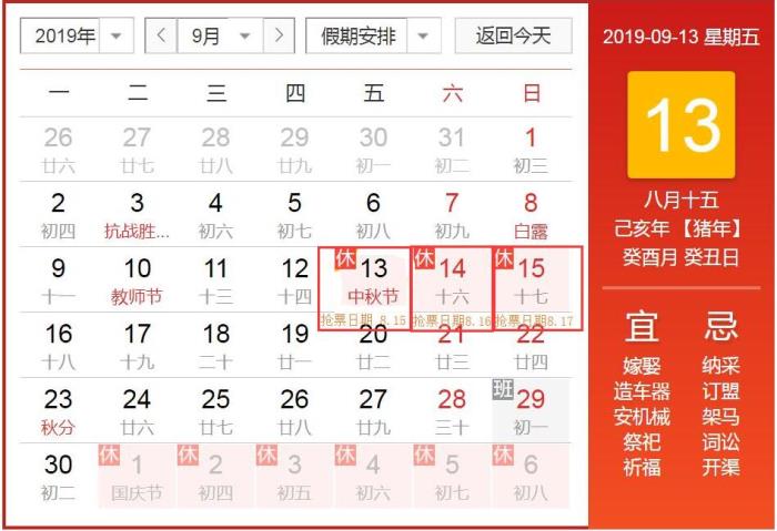 2019年中秋节放假安排