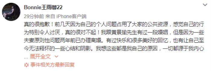 而就在瓜众以为故事已经到此为止的时候,19日晚间女主王雨馨亲自发文回应,承认“跟黄景瑜先生有过一段婚姻。”表示两人“有过快乐和很多美好的回忆,也有让自己至今无法释怀的一些心结和阴影”,轻生苏醒后意识到自己的行为“非常傻”。最后,她否认了有孩子的传闻。
