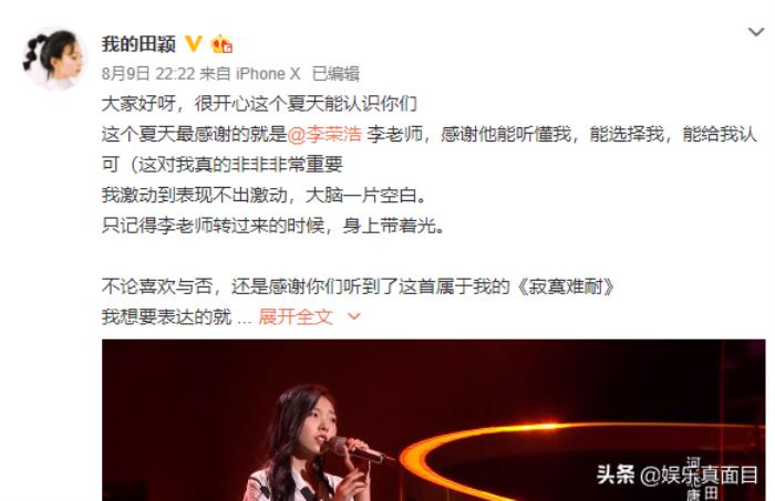 对于导师李荣浩的转身,田颖也在自己的微博上表示感谢,感谢李荣浩能够听懂自己的演唱,感谢李荣浩的认可。