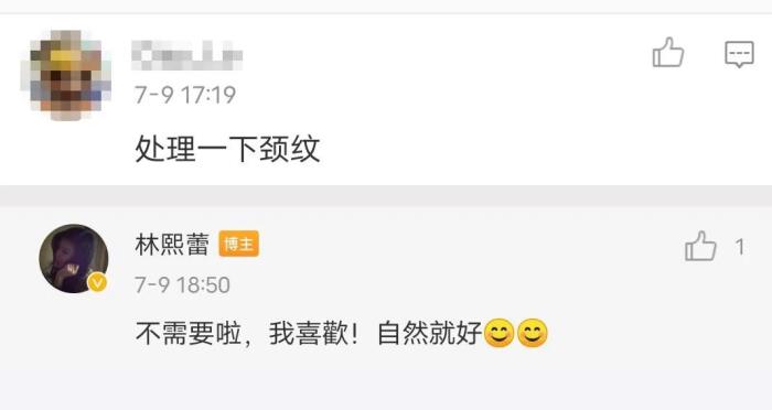 有网友留言说让她处理一下颈纹,林熙蕾大方表示:“不需要啦,我喜欢!”