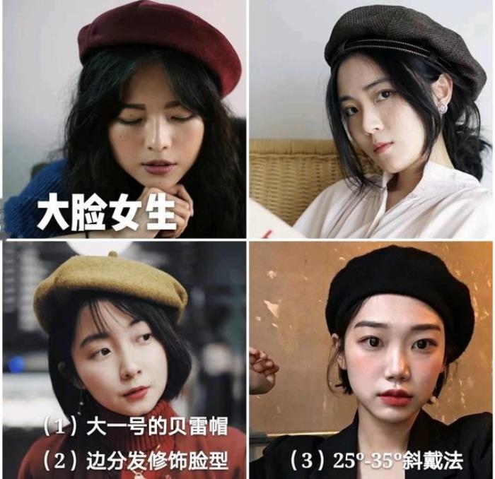 不管是大脸还是圆脸的女生,贝雷帽都是很适合的。不过对于大脸的女生来说,在佩戴贝雷帽的时候,佩戴的方式是很重要的。首先要选择大一号的帽子,再利用刘海来进行修饰脸型,例如将头发放下来,中分偏分都可以。还有就是戴法,斜着来佩戴,更好看!