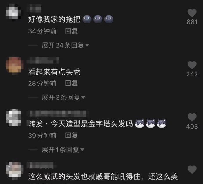 网友们也是评论道:"好像我家的拖把""看起来有点头秃""今天造型是金字塔头发吗?"但也有网友表示戚薇这个造型还是很霸气的,也有说:"这么威武的头发也就戚哥能吼得住,还这么美。"
