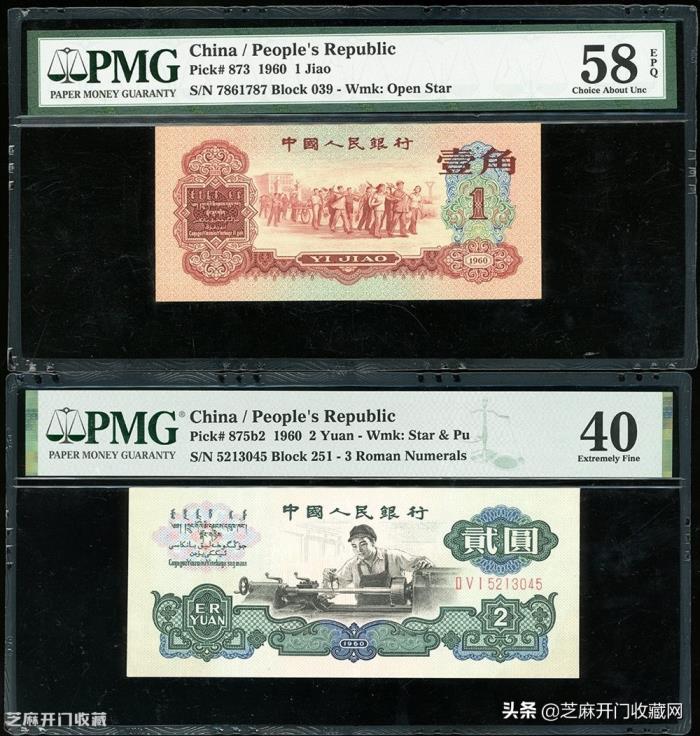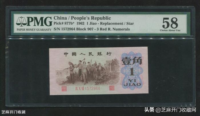 2:1962年第三版人民币壹角一枚,背绿水印,补号,PMG 58,估价: RMB 19500,成交价格: RMB 46000