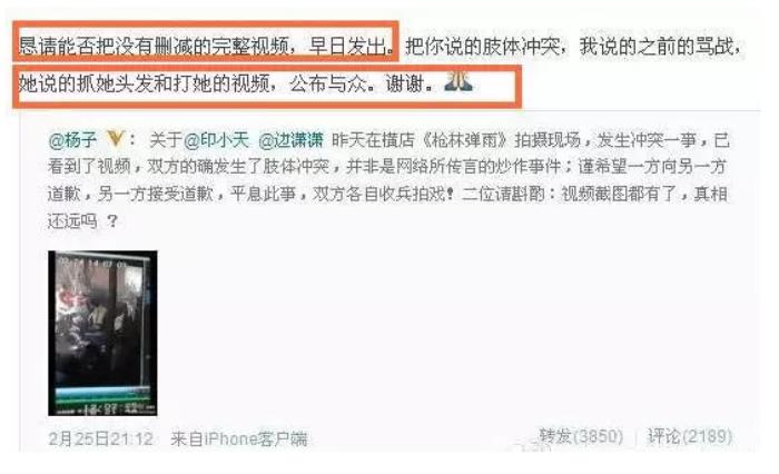 @印小天“……恳请能否把没有删减的完整视频,早日发出。把你说的肢体冲突,我说的之前的骂战,她说的抓她头发和打她的视频,公布与众。谢谢。”