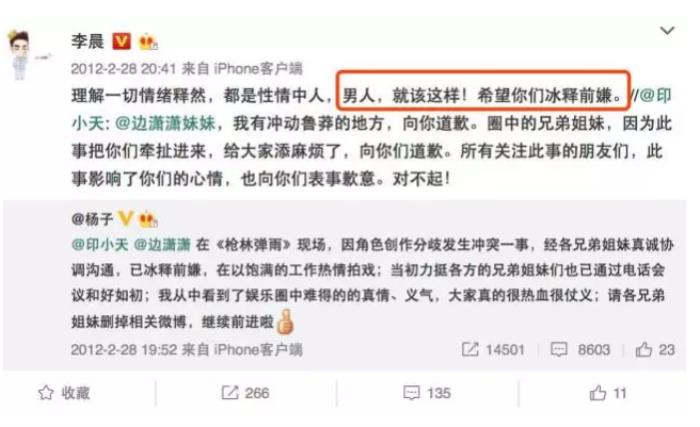 @杨子:”印小天边潇潇在《枪林弹雨》现场,因角色创作分歧发生冲突一事,经各兄弟姐妹真诚协调沟通,已冰释前嫌,在以饱满的工作热情拍戏;当初力挺各方的兄弟姐妹们也已通过电话会议和好如初;我从中看到了娱乐圈中难得的真情、义气……”
