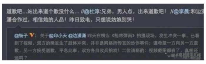 @杨子 :“关于印小天、边潇潇昨天在横店《枪林弹雨》拍摄现场,发生冲突一事,已看到了视频,双方的确发生了肢体冲突,并非是网络所传言的炒作事件;谨希望一方向另一方道歉,另一方接受道歉,平息此事,双方各自收兵拍戏!二位请斟酌:视频截图都有了,真相还远吗 ?”