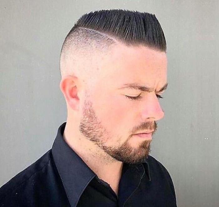 圆脸男生选择两边铲光的发型,可以追求得更加极致一些。首先保持两边的不留一点头发,然后在头顶的头发做文章,通过不同的长度修剪,让发型从前面到后面有一种三角形的造型观感,同时还可以在一旁刻上一道杠增加直线感,整个发型就变得更加棱角分明,从而淡化了圆脸的感觉。