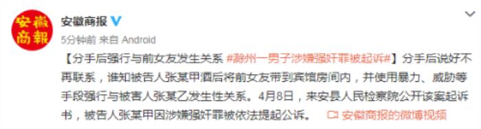 【分手后强行与前女友发生关系 滁州一男子涉嫌强奸罪被起诉】分手后说好不再联系,谁知被告人张某甲酒后将前女友带到宾馆房间内,并使用暴力、威胁等手段强行与被害人张某乙发生性关系。4月8日,来安县人民检察院公开该案起诉书,被告人张某甲因涉嫌强奸罪被依法提起公诉。