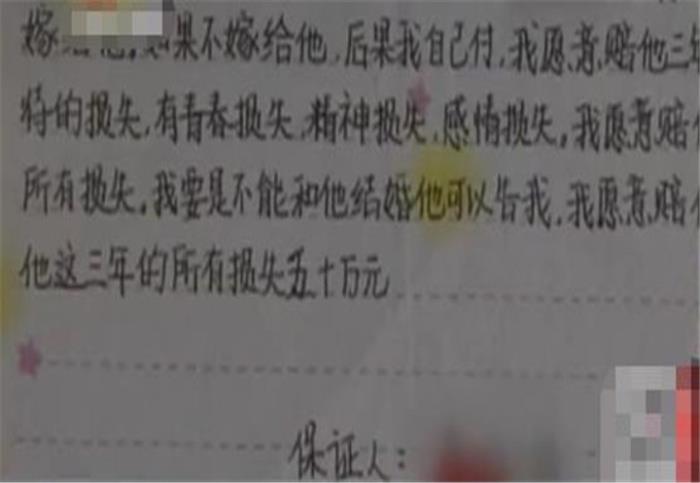 这时静静就说了,叔叔阿姨别担心,我给您写份保证书,保证我以后绝对会嫁给大山,我这辈子就想和他在一起,就是和他结婚。于是在上大学之前的暑假,静静拿出了这样一份保证书。除了承诺自己一定会嫁给大山之外,还保证自己要是不能和他结婚,大山可以告她,她愿意赔偿他三年的所有损失五十万元。最终大山的父母放下了顾虑,他们的生活又安稳地继续下去了。
