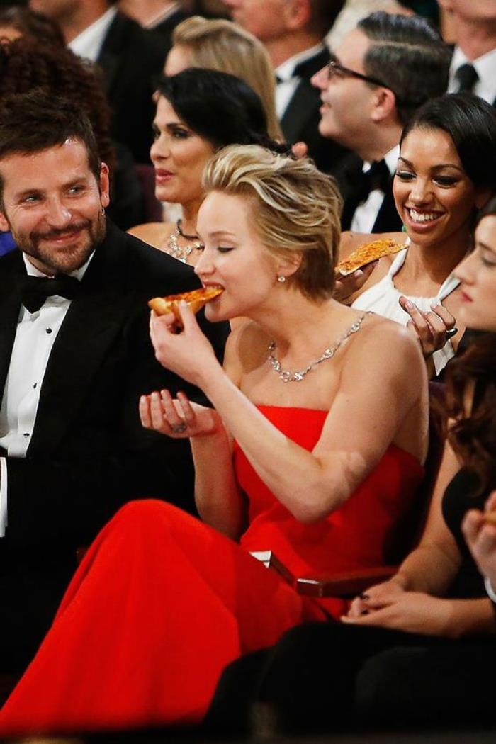 穿着猩红色的晚礼裙,佩戴着钻石项链,却在奥斯卡颁奖礼上大口吃披萨,詹妮弗展现出非常可爱的一面,不做作的样子连身旁的布莱德利·库珀都充满了欣赏。