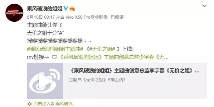 近日《乘风破浪的姐姐》主题曲《无价之姐》发布,再度引发全网热度,风评大好。