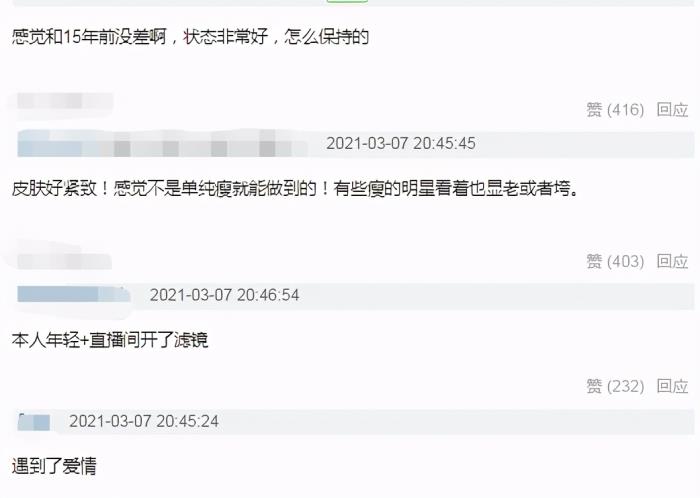 正如网友说的,谢霆锋的皮肤好紧致,感觉不是单纯瘦就能做到的,因为有些明星就算身材保持得很好,但毕竟年纪大了看着就会显老,或者脸的皮肤会松弛。有网友觉得,谢霆锋看起来这么年轻,一是本人确实年轻,二是直播间开了滤镜的关系。也有网友觉得是他有爱情滋润的关系。