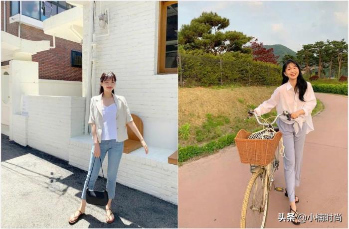 ▲简约的西装套装,配上小白鞋,休闲风满满。首选材质也不是普通的西服料子,而是适合夏天的棉麻材质,凉爽又舒服,还带点小文艺范。棉麻材质的衣服在夏天比较受欢迎是由于它很透气,体验感好,夏天可以选择这种面料的裤子,搭一件针织带带,别提多爽,还可以加一件衬衫作为外搭。