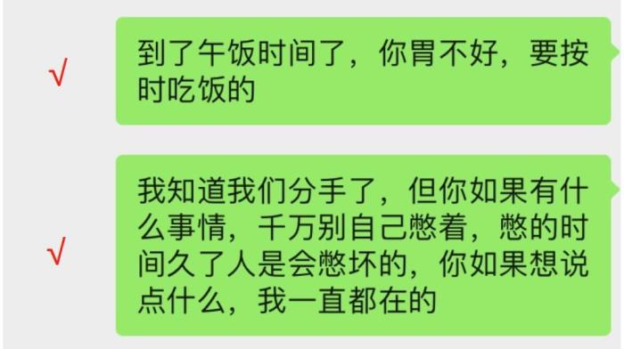 到了午饭时间了,你胃不好,要按时吃饭的(目的1达成),或者:我知道我们分手了,但你如果有什么事情,千万别自己憋着,憋的时间久了人是会憋坏的,你如果想说点什么,我一直都在的(目的2达成)。