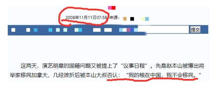 3月23日,某媒体对赵本山进行了电话采访,采访中提到国籍一事,赵本山明确否认了网络上传闻他们一家移民加拿大的消息,表示:"没有那事,那是假的,我从没有移民,我们全家户口都在辽宁"。