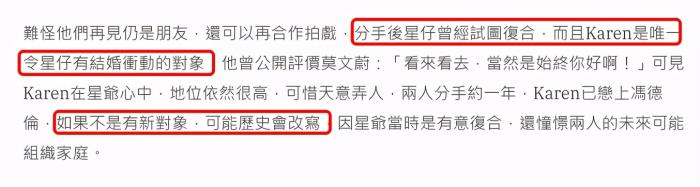 可惜天意弄人,两人分手约一年的时候,周星驰其实有意复合,还憧憬两人的未来可能组建家庭,可莫文蔚那时已经恋上了冯德伦,引白露眉感慨:“如果不是有新对象,可能历史会改写。”