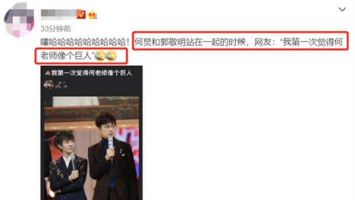 在12月12日晚,郭敬明的身高又一次遭到了网友们的吐槽。为了给电影《晴雅集》做宣传,郭敬明和邓伦、赵又廷等人一起上了《快乐大本营》。让人没想到的是,当郭敬明和主持人何炅站在一起时,竟然比何炅矮了足足一个头。看到这一画面,有网友忍不住发文吐槽“第一次觉得何老师像个巨人”。何炅公开的官方身高是172cm,然而在身高普遍较高的娱乐圈里,却显得有些矮小。