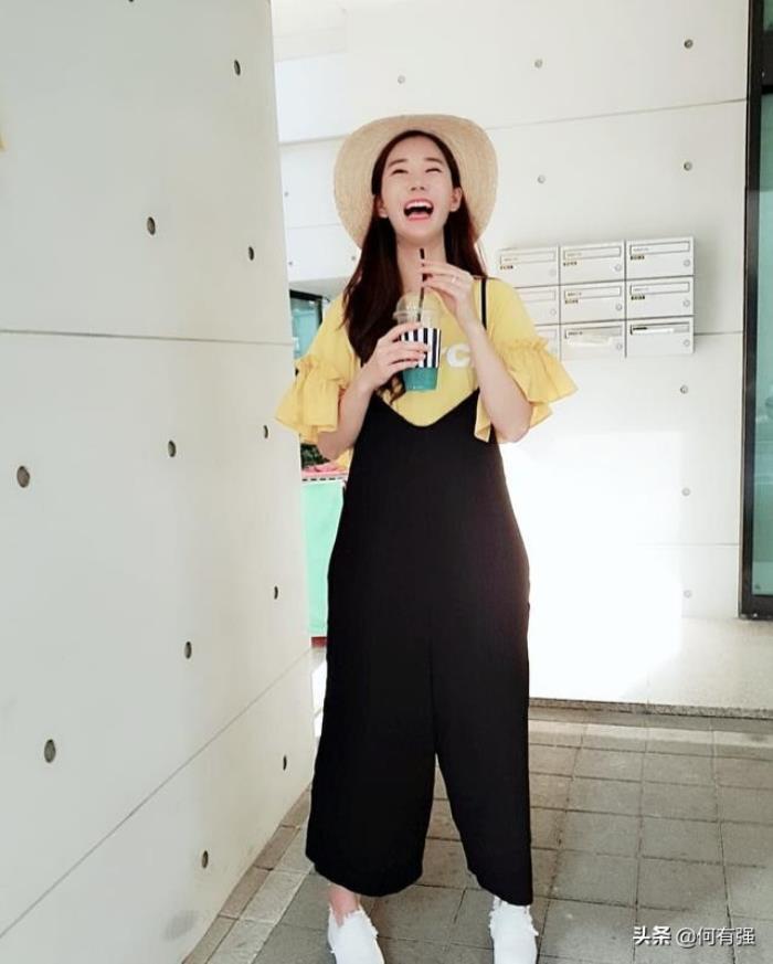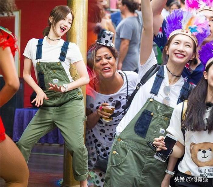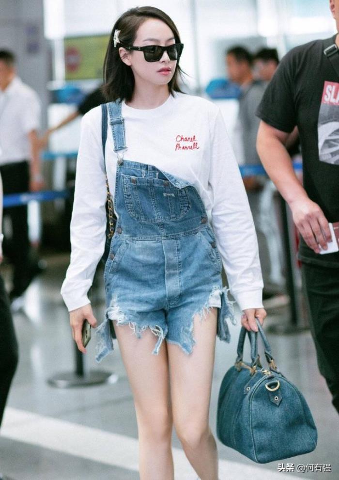 背带裤的普通穿法过时了,戚薇把带子系在腰上,俏皮活力又减龄
