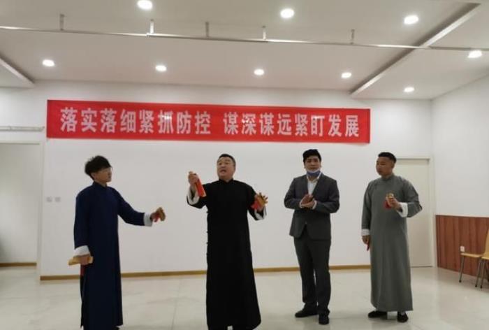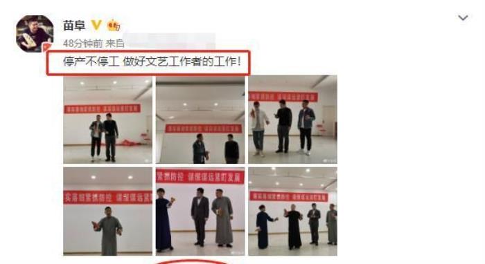 在郭德纲发了微博后不到3个小时,苗阜就晒出了6宫格工作照片,配文“停产不停工,做好文艺工作者的工作!”照片中,几位相声演员似乎正在一个空荡荡的室内排练相声,这个房间的大白墙上还挂着红色的大横幅,上面写着“落实落细紧抓防控,谋深谋远紧盯发展”。