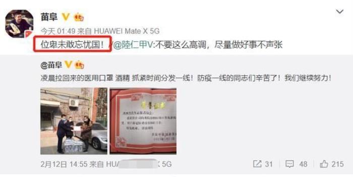 此前,郭德纲在给武汉捐款100万之后,1月26日在微博作出了7字回应“位卑不敢忘忧国”。苗阜也慷慨解囊,为武汉捐赠物资,并在2月15日凌晨回应网友质疑,一字不差的“模仿”郭德纲,说了“位卑不敢忘忧国”七个字。