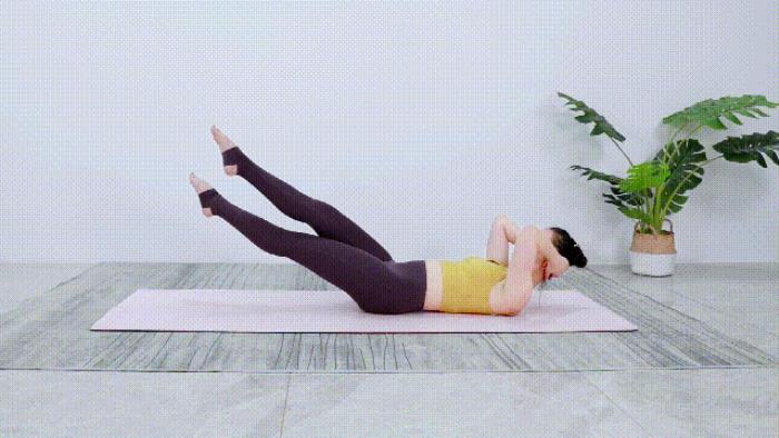 将双手放在耳后,上半身微微抬起,吸气双腿曲膝收向胸口,呼气双腿伸直,感受到小腹在收紧发力。动作重复30次。