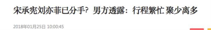 2018年1月25日,宋承宪方面以聚少离多为由证实与刘亦菲已经分手,这段持续了两年多的恋情彻底落下帷幕。虽然期间交集不多,但是两人甜蜜共度也是历历在目,而后宋承宪与高雅拉也频传感情进入稳定期。