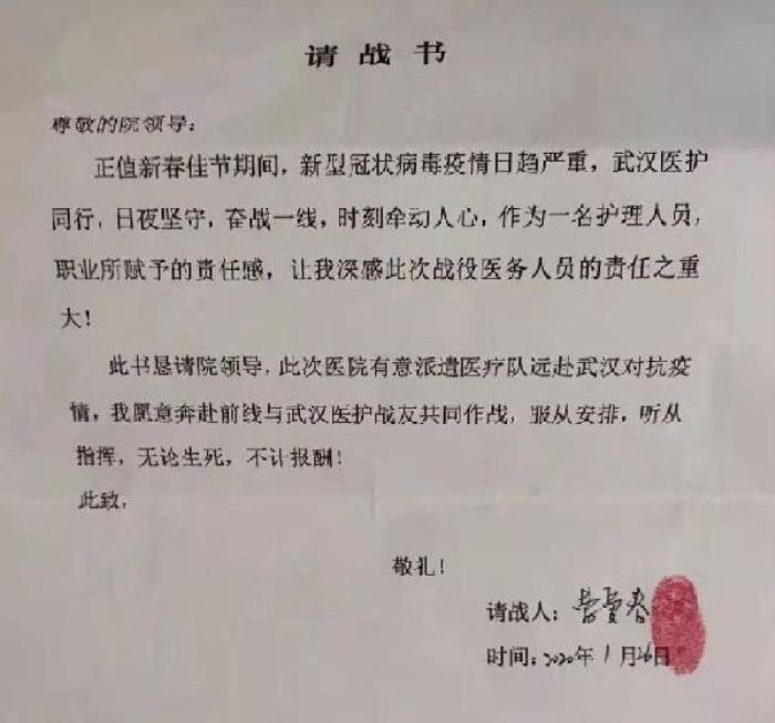甘肃省定西市人民医院新生儿科护士长曹爱春和护士邢亚半夜写下请战书,恳请院方批准奔赴一线。落款时,两人写了八个字:无论生死,不计报酬。