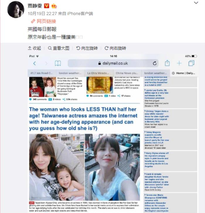10月19号晚上贾静雯在自己的微博上更新了一个动态,贴上了英国每日邮报的一篇文章,并且写到:原来年龄也是一种赞美。”