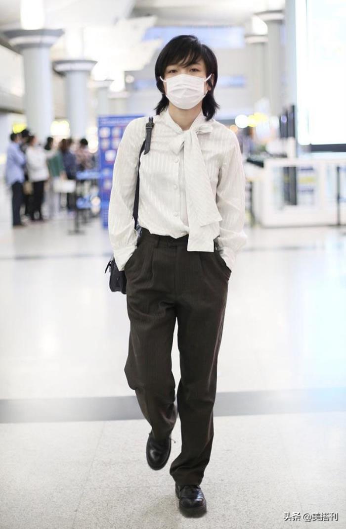 许飞一直是走这种酷酷的风格,她本身长相就比较中性,甚至带着几分英气,正适合走酷帅小姐姐风。她本人私下里也很喜欢穿中性风单品,像这身衬衫配西裤皮鞋的造型就又酷又飒,灰白色的条纹衬衫,领口多了一条领带,领带打成斜蝴蝶结设计,甜美不失个性。下身的西裤颜色和面料都带着满满的帅气和质感,皮鞋更加持了这份酷帅,许飞还是短裤,带着口罩,帅得有些分不出性别了。