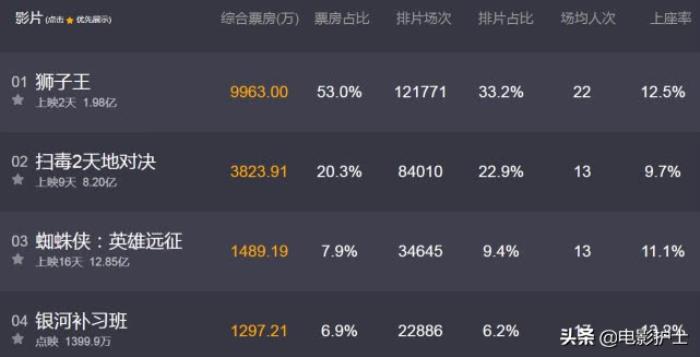《扫毒2》口碑爆棚,观众口口相传,该片是目前为止暑期票房火力最猛的影片之一。从它昨日的场均上座率23人次看,下周逆袭反超《狮子王》重新登顶票房冠军的可能性很大。迪士尼新片其实就是一部动物世界,然后包装一下说什么情怀怀旧,这只能哄哄小朋友,大人观众对这部电影其实兴趣不大,它的票房后劲是难持久的。