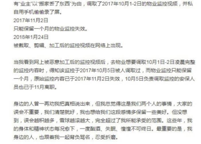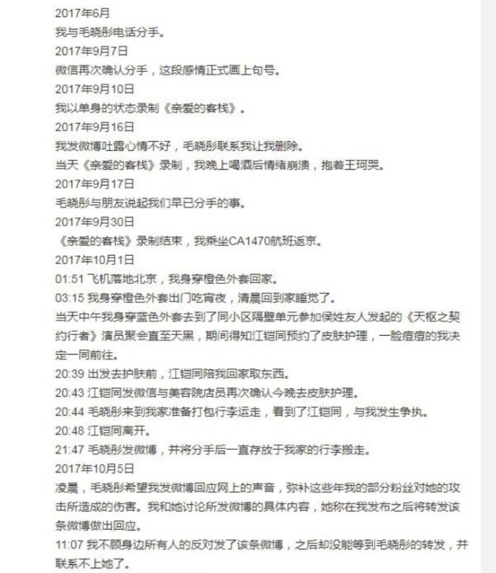 他贴出事件时间线,以此来描述称2017年6月就已和毛晓彤电话分手,9月7日两人正式微信分手,10月1日与江铠同只是朋友聚会,相约去做皮肤护理,最后江铠同陪同他回家中取东西,没想到监控视频“被截取,加工,剪辑”引起了后来的一系列舆论风暴。