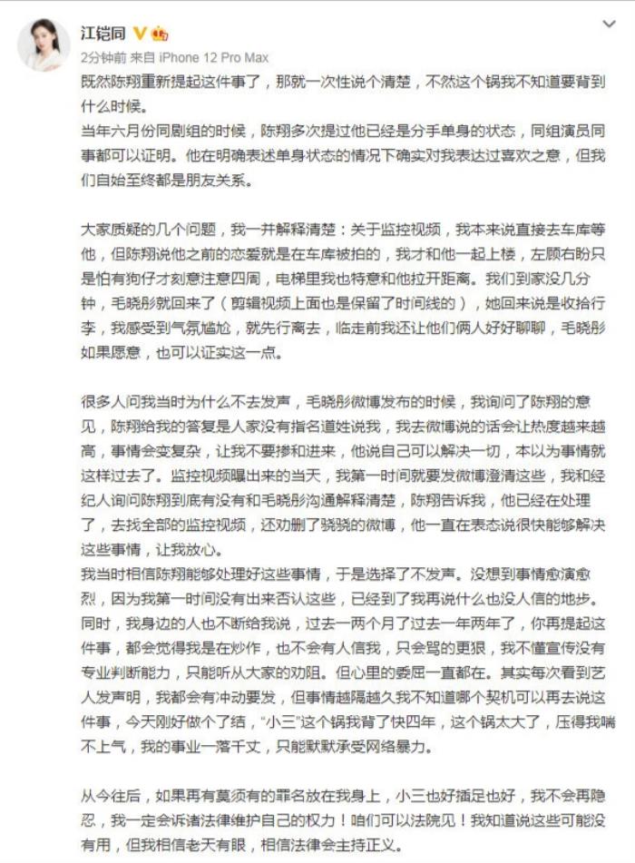 下午,曾经事件的另一女主角江铠同也在社交平台上发布长文,否认第三者传闻,并同时在文中表示与陈翔只是朋友,因此事导致事业一落千丈,已隐忍了4年。