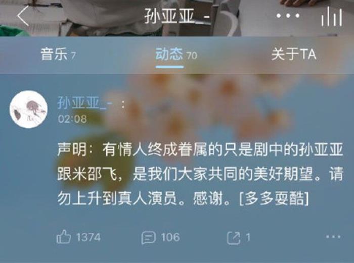 不过姜珮瑶在某个社交平台中对此作出了回应,称在一起的是孙亚亚和米邵飞,现实生活中并没有感情:“有情人终成眷属的是孙亚亚和米邵飞”,委婉的向网友否认了恋情传闻。