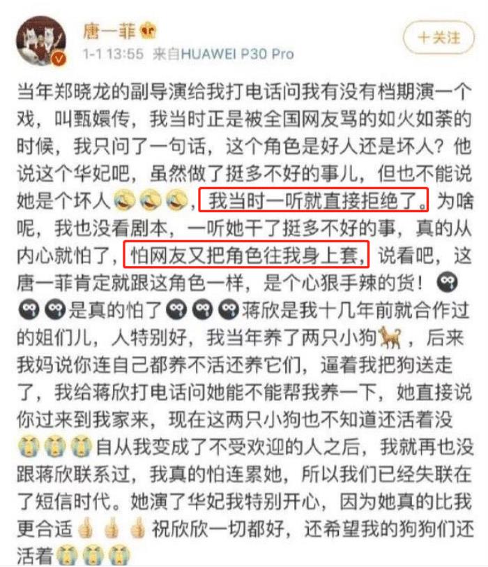 《甄嬛传》中华妃一角让蒋欣一拍而红,然而2020年唐一菲透露,该剧的导演最开始其实找她饰演华妃,但是唐一菲看到剧本之后,因为担心出演华妃一角被骂,所以就拒绝了邀约,最终这个角色才得以花落蒋欣。