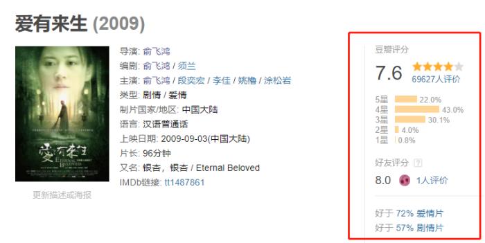 她自己编导的《爱有来生》,豆瓣7.6分,好于七成爱情片,说明她个人对于影视作品的好坏是有基本评判力的。