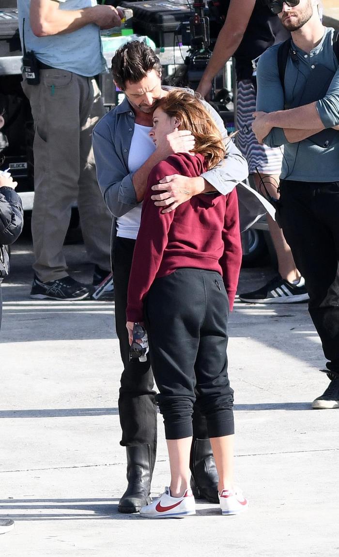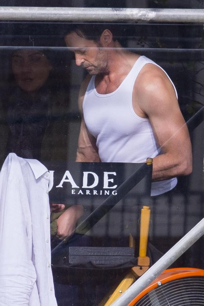 彦祖这边,腹肌清晰可见,可能是片场真的太热了,他解开衬衫全部的扣子,走在片场,并表情严肃的和工作人员交谈。