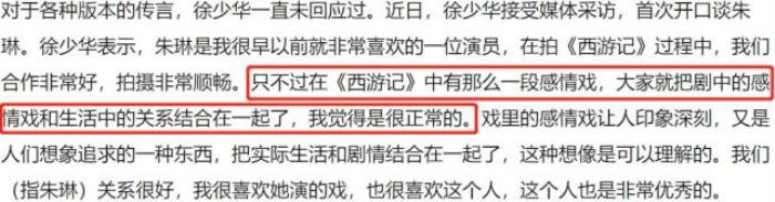 徐少华还讲道当时他们在《西游记》中有那么一段感情戏,大家就把剧中的感情戏和生活中的关系结合到一起了。不过,对于这件事,徐少华也表示这种想象是可以理解的,他个人很喜欢朱琳演的戏,徐少华认为她非常优秀,所以也很喜欢朱琳这个人。