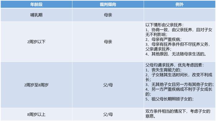 性别上。女孩2-8岁判归母亲的概率大于父亲,男孩2-4岁判归母亲的概率大于父亲,5-8岁判归父亲的概率稍大于母亲。(这些数据是根据个案统计,不能代表全部,仅供参考)